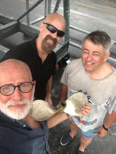 Stephan and Claude went to the engine room as I worked the throttle. They reported the engine was revving and shaft turning but no movement of the boat nor churning of water. Stephan, an experienced sailor, was saying it was as if there wasn’t a propeller. Another sailor sempai, Rick of the TSPS (Tokyo Sail and Power Squadron), stripped down to his shorts, dove under the boat to confirm.